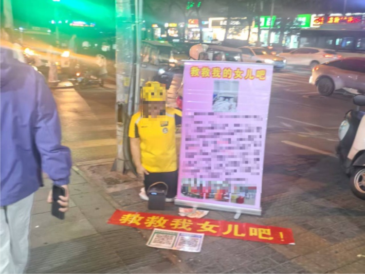 一位身穿外卖员骑手衣服的女子跪在西安闹市街头,手扶展板写着“救救我女儿吧”。不远处,付出二维码摆在地上。